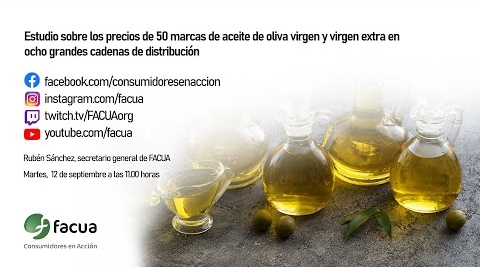 El secretario general de FACUA-Consumidores en Acción, Rubén Sánchez, presenta en rueda de prensa un estudio comparativo sobre los precios de 50 marcas de aceite de oliva virgen y virgen extra a la venta en ocho grandes cadenas de distribución.